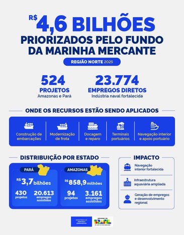 Os projetos da Marinha Mercante priorizados para a Região Norte em 2025 somaram R$ 4,6 bilhões em recursos do Fundo da Marinha Mercante (FMM), com 524 iniciativas aprovadas nos estados do Amazonas e do Pará. As ações contemplam construção e modernização de embarcações, implantação e melhoria de terminais portuários, além de atividades de docagem e reparo, reforçando a navegação interior e o fortalecimento da infraestrutura aquaviária.