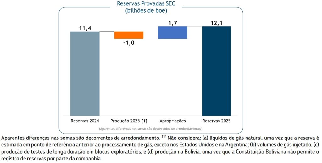 Petrobras informa que suas estimativas de reservas provadas de óleo, condensado e gás natural, segundo critérios da SEC (US Securities and Exchange Commission), resultaram em 12,1 bilhões de barris de óleo equivalente (boe), em 31 de dezembro de 2025. Deste total, 84% são de óleo e condensado e 16% de gás natural.